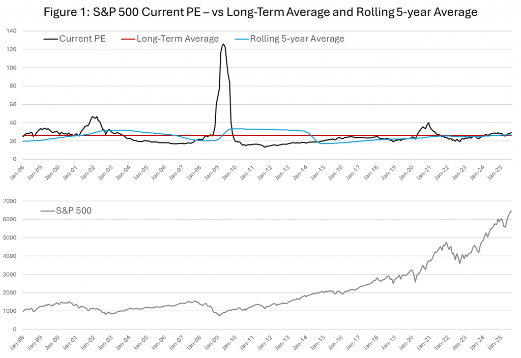 In our example we have used the S&P 500 index. See figure 1 by way of illustration. It uses data from 1998 to the present to incorporate the pre and post dotcom bubble, since some investors are worried that the AI trade may have some resemblance to it.