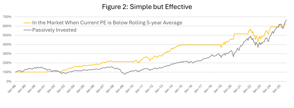 Patterns can be found in the data, for instance when the Current PE level ascended above the Rolling 5-year Average in 2007 that looks like a good time to have left the market but can this observation be translated into a working system that worked on the basis of being in the market when the Rolling 5-year Average is higher than the Current PE? We should bear in mind, of course that this system is being built with the benefit of hindsight. To its credit though, a simple system such as this performs very well by comparison to doing nothing and remaining passively invested in the S&P 500, as is shown in Figure 2.