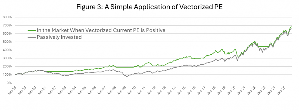 Ultimately this model achieves a very impressive more than two-fold return over the S&P 500, +1,539% vs +689% and it does this with a lower annualized volatility, 12.9% vs 15.4% for the S&P 500. It is of course far from perfect, for example, it remains in the market just like the passive, throughout the entirety of the decline in 2022. In conclusion it indicates that Vectorized PE can be quite easily applied to create sensible investment strategies. Some food for thought for investors as they try to assess the best market positions to adopt in the coming months. ■