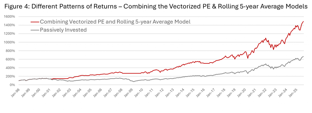Beyond showing that it performs slightly better over the long-term than the S&P 500, it is clear that the this approach does not participate fully in the large market recoveries. Instead it performs with more consistency and less volatility by missing out on the dramatic falls thus losing less and being able to maintain its performance by compounding those returns, without having to dig itself out of a hole. More interestingly though is the difference between the Rolling 5-year Average model and the Vectorized PE model. They clearly are both protective but have a different patterns of returns. This leads to the conclusion that they can be used in conjunction with one another.